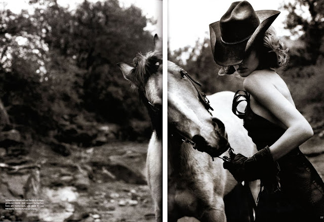 Such a stunning shoot - the harsh, yet beautiful background, the horses, the voluminous hair, cool cowboy hats and the dramatic clothes. My favourite pieces have to be the bodysuit in the first pic and the Swarovski encrusted Balmain dress in the second last pic.